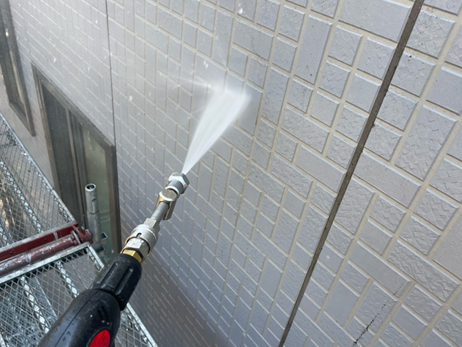 高圧洗浄で旧塗膜や汚れ・苔を徹底除去。塗料の密着性を高め、耐久性に直結する重要工程。