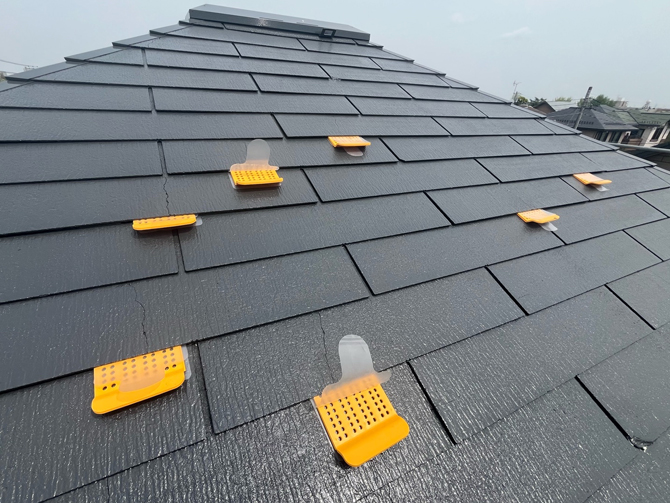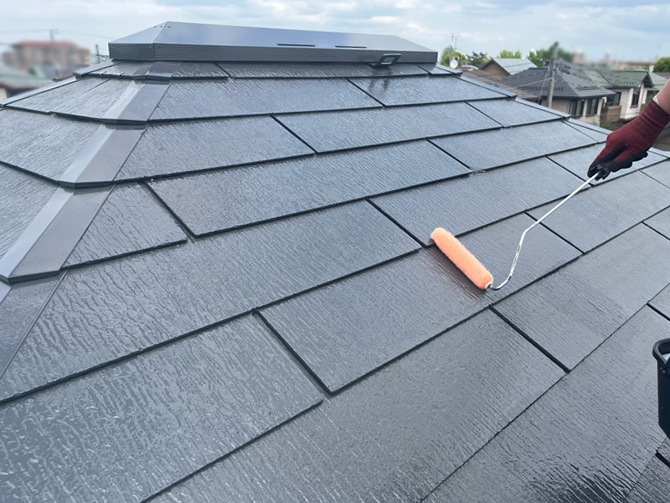 屋根塗装(下塗り → ガイソーマルチコート → ハイグロストップ)。光沢と撥水性能を強化。