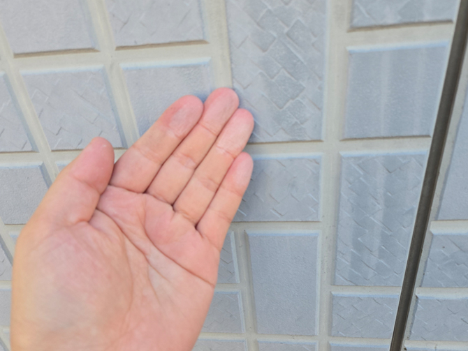 外壁は全体的に色褪せとチョーキング現象が進行、特に南面で顕著。