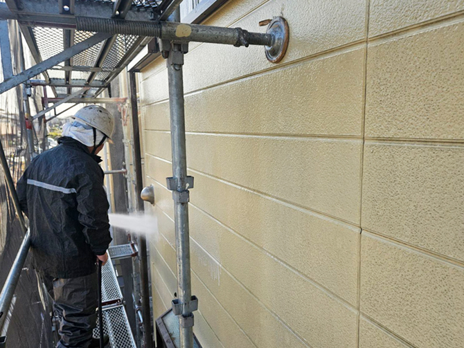 外壁や屋根の表面に付着したホコリ・カビ・古い塗膜を高圧洗浄機で丁寧に洗い流します。